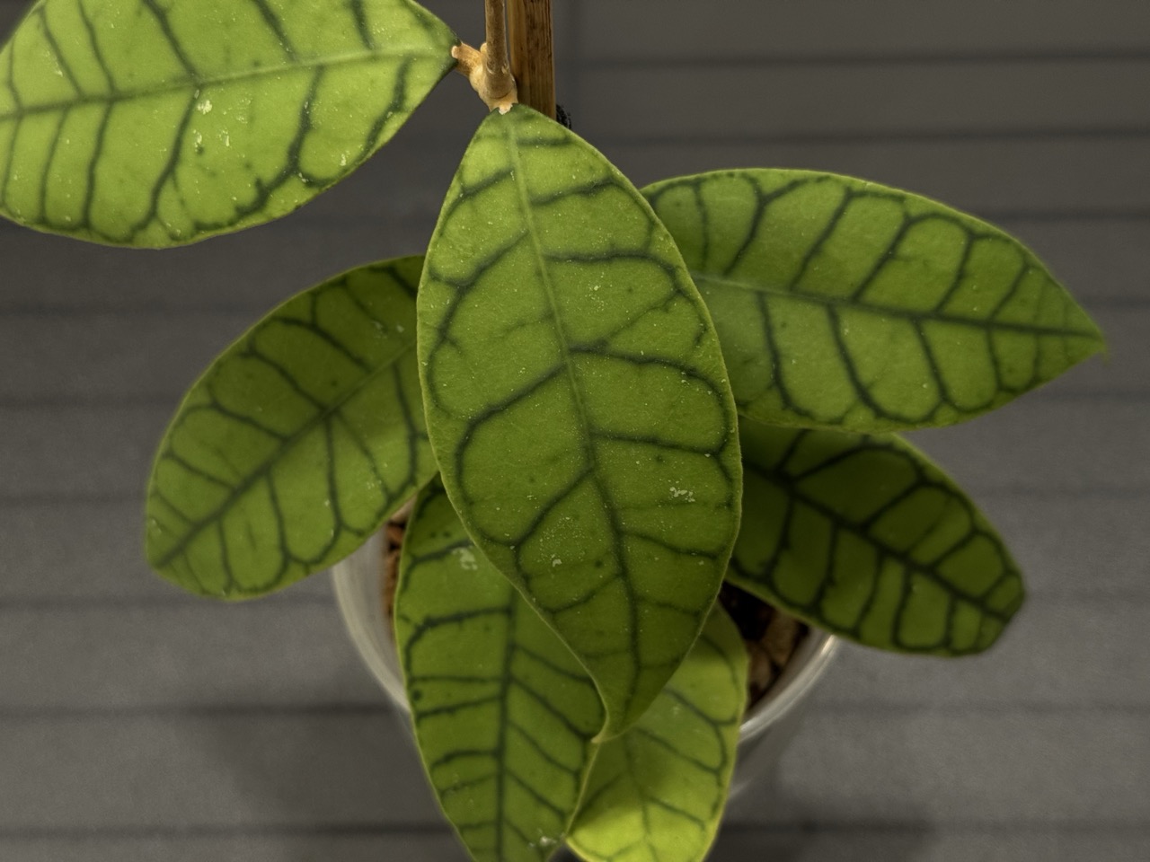 Hoya callistophylla is a collector-favorite species distinguished by its thick leaves and striking dark venation. Growth is slow and deliberate, with new leaves emerging infrequently but developing impressive size and texture.
