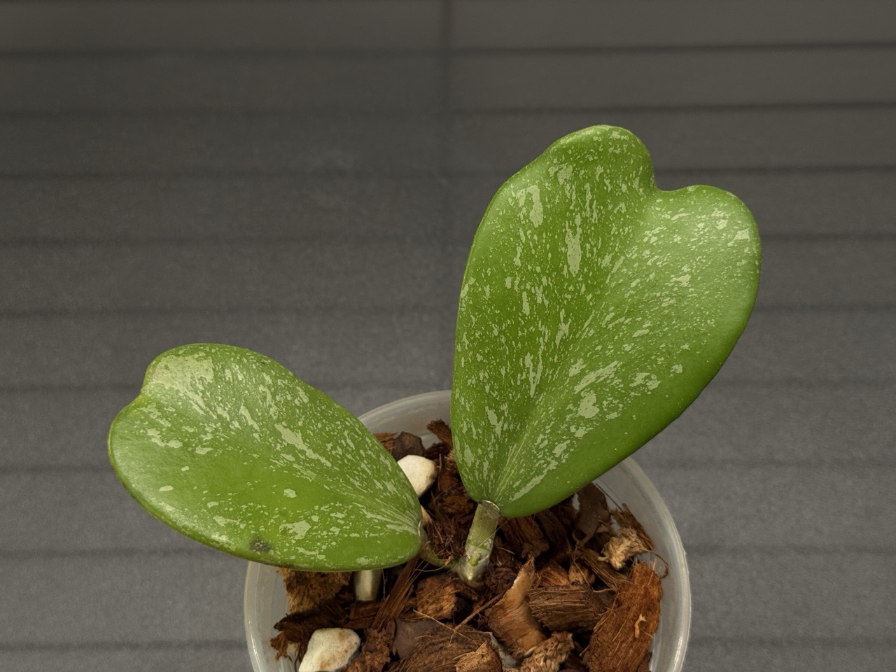 Hoya kerrii (Splash) features the thick, heart-shaped leaves characteristic of the species, overlaid with irregular silver markings that add quiet visual texture. Growth is slow and deliberate, with long pauses between new leaves, making this cultivar best suited for patient, intentional cultivation.